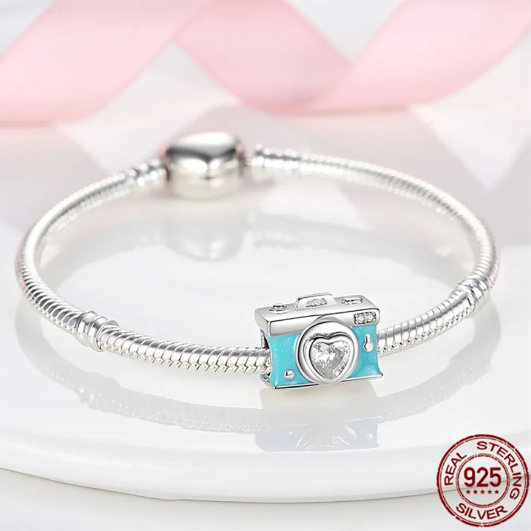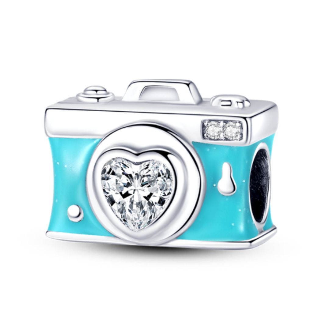 This Camera Charm is the perfect way to showcase your love for photography in style. This exquisite charm is the perfect addition to any jewellery collection and is sure to catch the eye of any photography enthusiast. The Camera Charm features a stunning blue finish and a unique heart-shaped lens design that adds a playful touch to the charm. The intricate details and vibrant color make it a true work of art, sure to impress anyone who sees it; and can easily be added to a bracelet. Whether you're a professional photographer or simply someone who loves capturing life's special moments, the Camera Charm is the perfect accessory to showcase your passion for photography.
