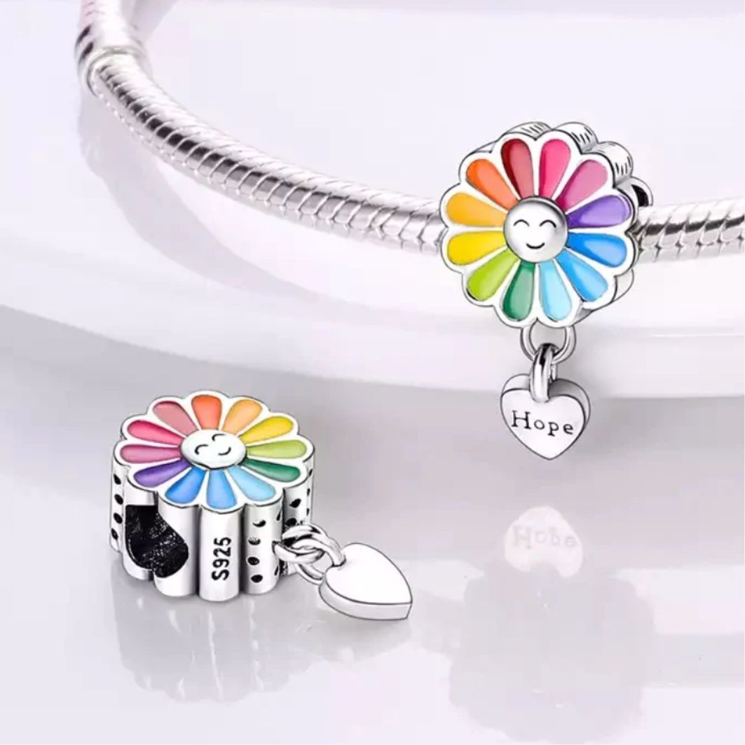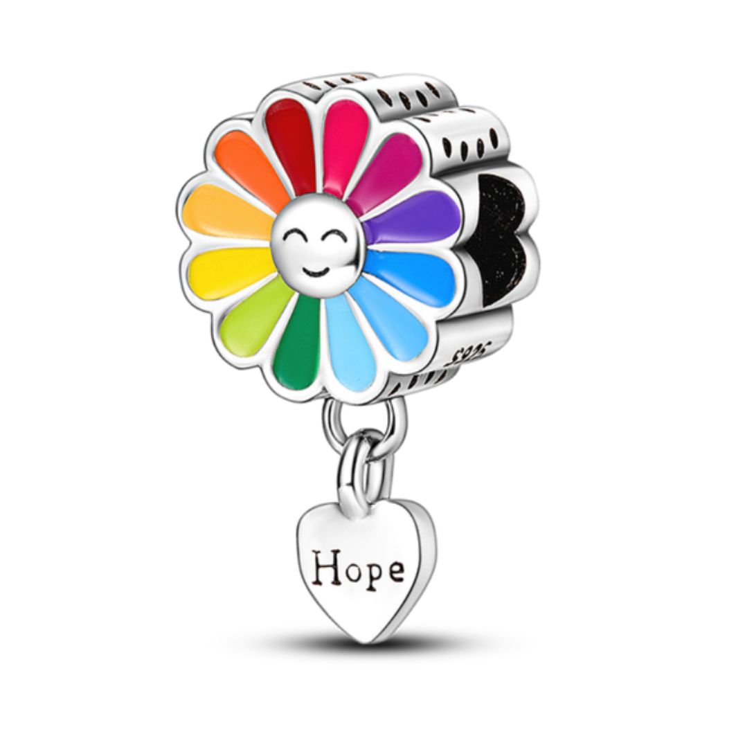 The Colourful Flower and Hope Charm is an uplifting and vibrant charm which captures the beauty of nature, the power of hope, and the promise of new beginnings; great for those who appreciate the wonders of the natural world, the optimism of brighter days, and the inspiration that comes from life's most cherished moments. The design features a stunningly detailed flower with delicately sculpted petals, adorned with a dazzling array of colourful enamel accents that evoke the energy of a blossoming garden. The charm is accompanied by an elegant, silver-plated "Hope" pendant, symbolizing the strength, resilience, and optimism that guide us through life's challenges and triumphs.