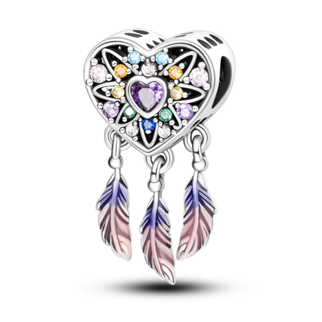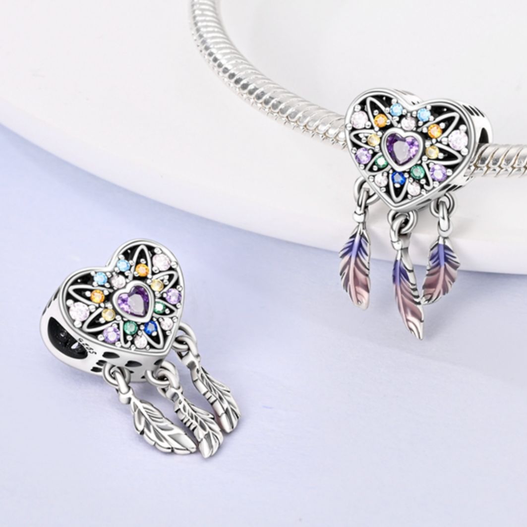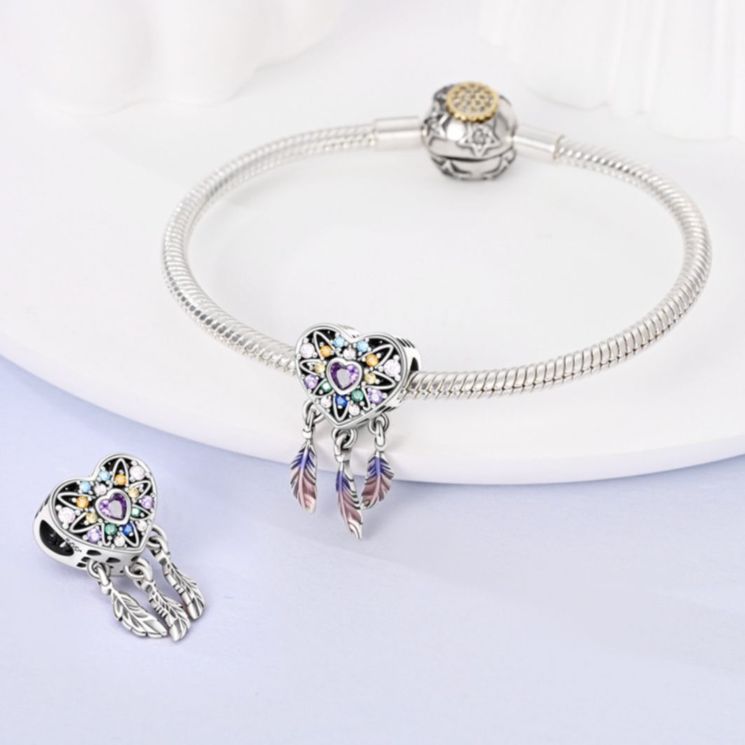 The charm boasts a captivating dream catcher, renowned as a talisman in Native American cultures, believed to filter dreams and only allow the good ones to pass through. It's interlaced within a radiant heart, signifying love, warmth, and affection. The combination provides a potent symbol of protection and love, making it an accessory with a deeply touching narrative.