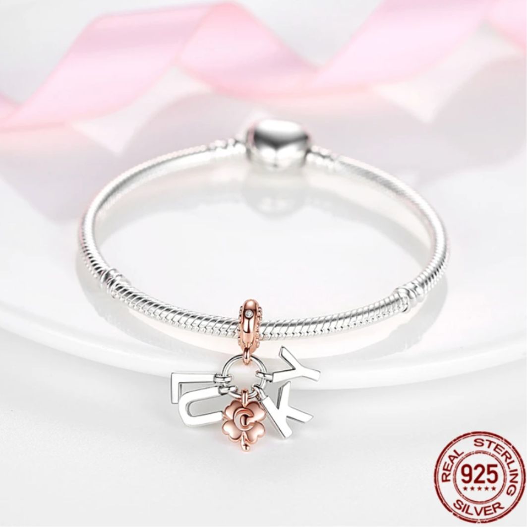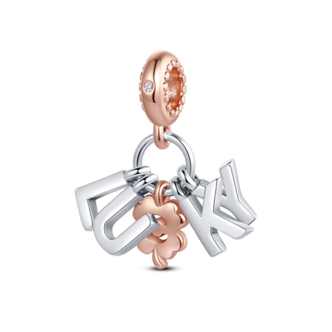 This charming and unique charm captures the essence of good luck and prosperity in a fun and playful way. The charm features the word "lucky" in silver with the letter 'c' replaced by a four-leaf clover in rose gold. The Lucky Charm is for those who believe in the power of good luck and appreciate the positivity and energy that comes with it. It is perfect for adding a touch of beauty and playfulness to your charm bracelet or necklace.