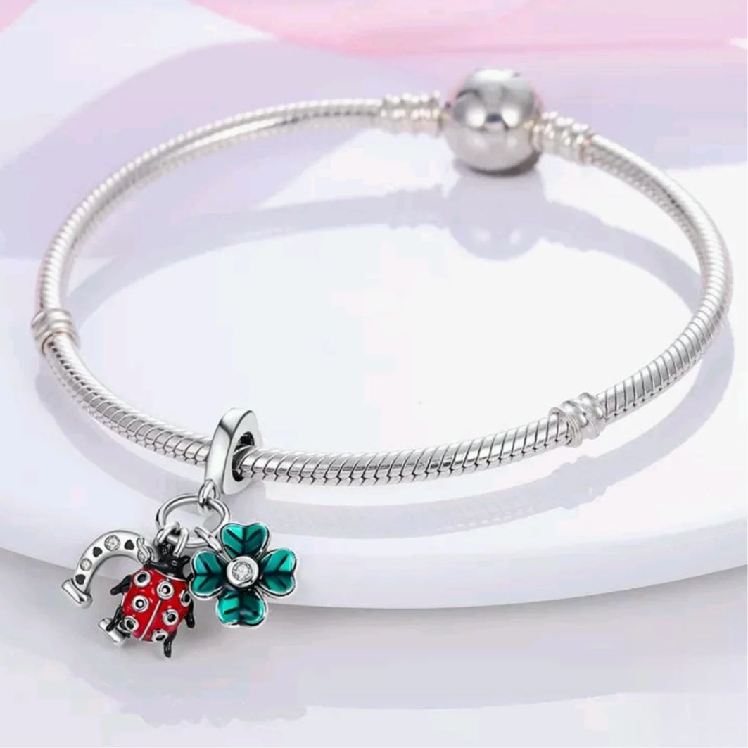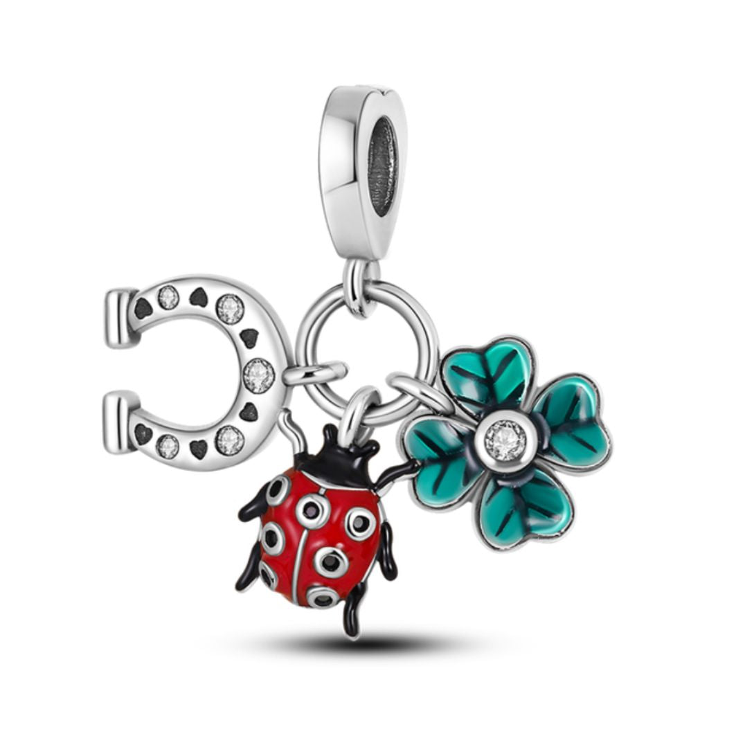 The Lucky Trio Charm is delightful and enchanting capturing the essence of good fortune, prosperity, and the magic of serendipity. It's perfect for those who believe in the power of luck, the joy of unexpected blessings, and the charm of life's little coincidences. The design features a beautifully detailed trio of good luck symbols, including a four-leaf clover, a horseshoe, and a ladybird. Each symbol is adorned with vibrant enamel, evoking a sense of wonder, whimsy, and the promise of fortune's favor. This captivating accessory embodies the essence of luck, the spirit of optimism, and the enchantment of life's serendipitous moments.