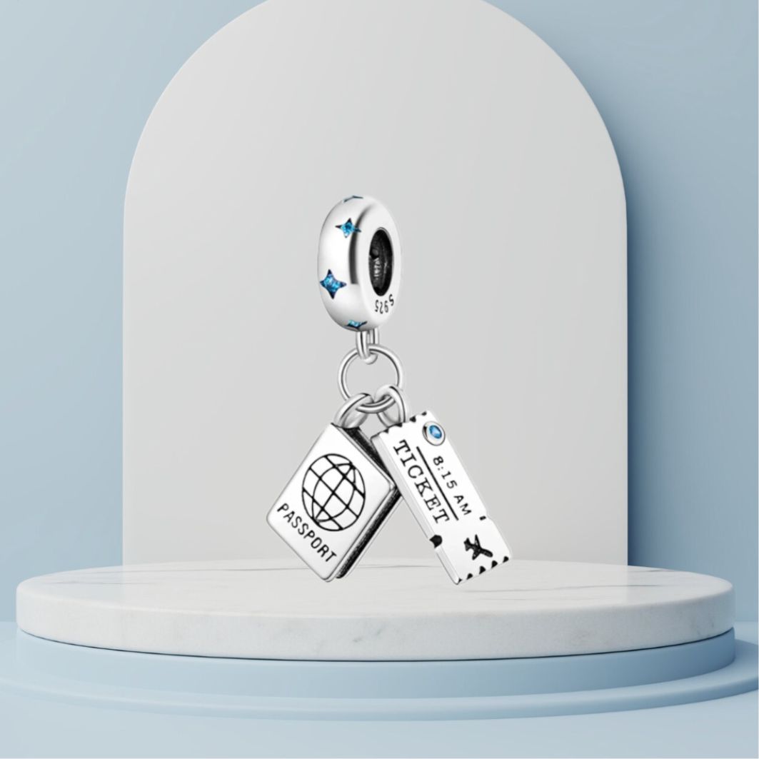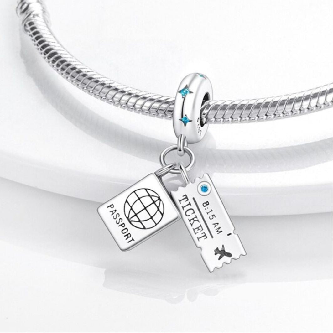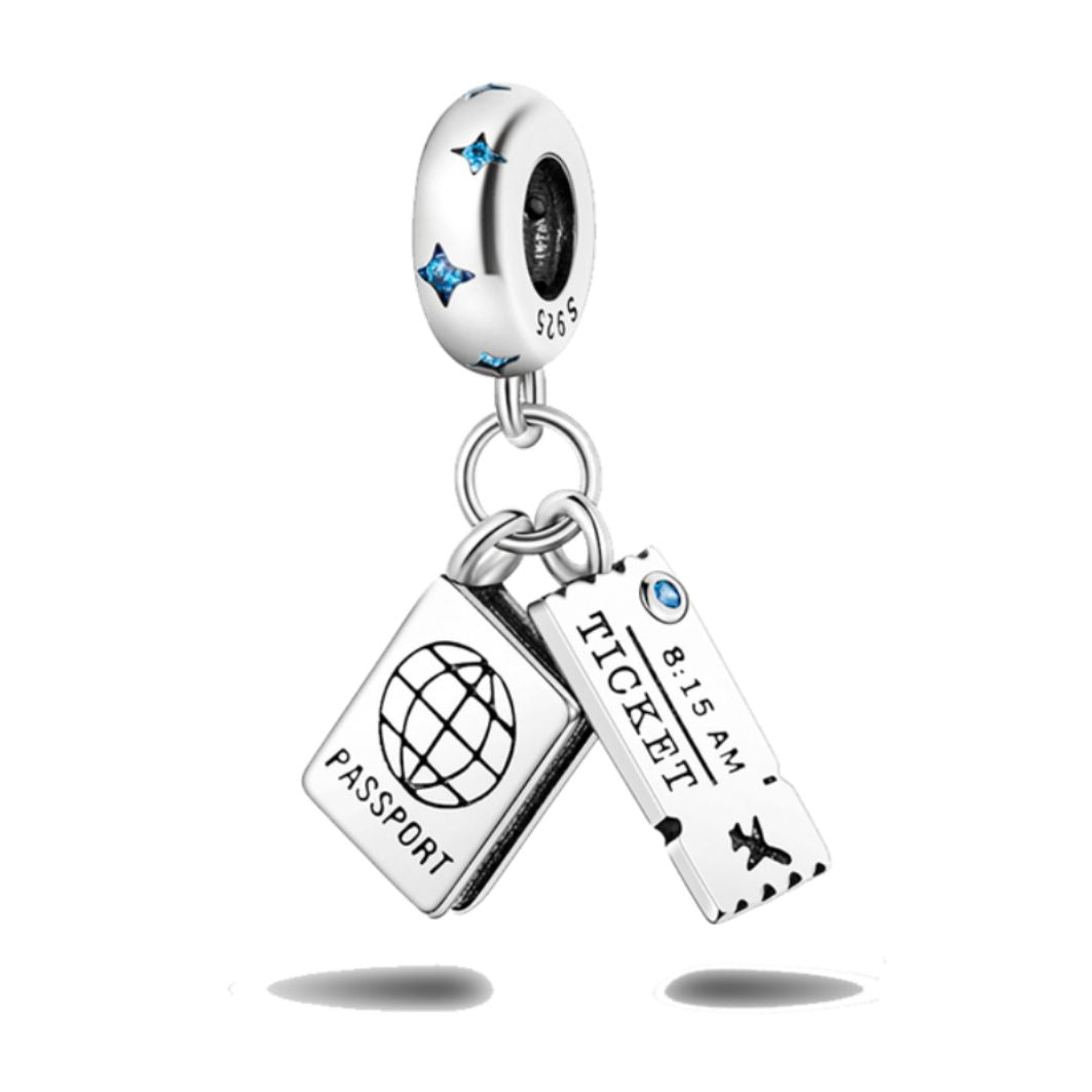 This charming and elegant charm captures the excitement and adventure of travelling to new destinations. The charm features a detailed design of a passport and plane ticket. The Passport and Ticket Charm is not only a great accessory for travel enthusiasts, but also makes a thoughtful gift for friends and family who appreciate the joy of exploring new places. It is perfect for adding a touch of sentimentality and adventure to your charm bracelet or necklace.