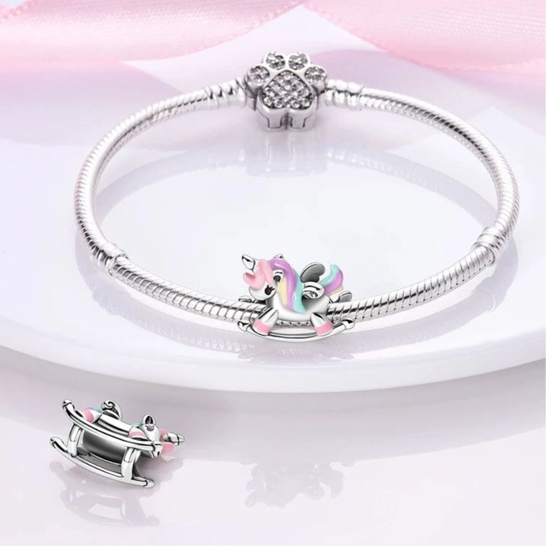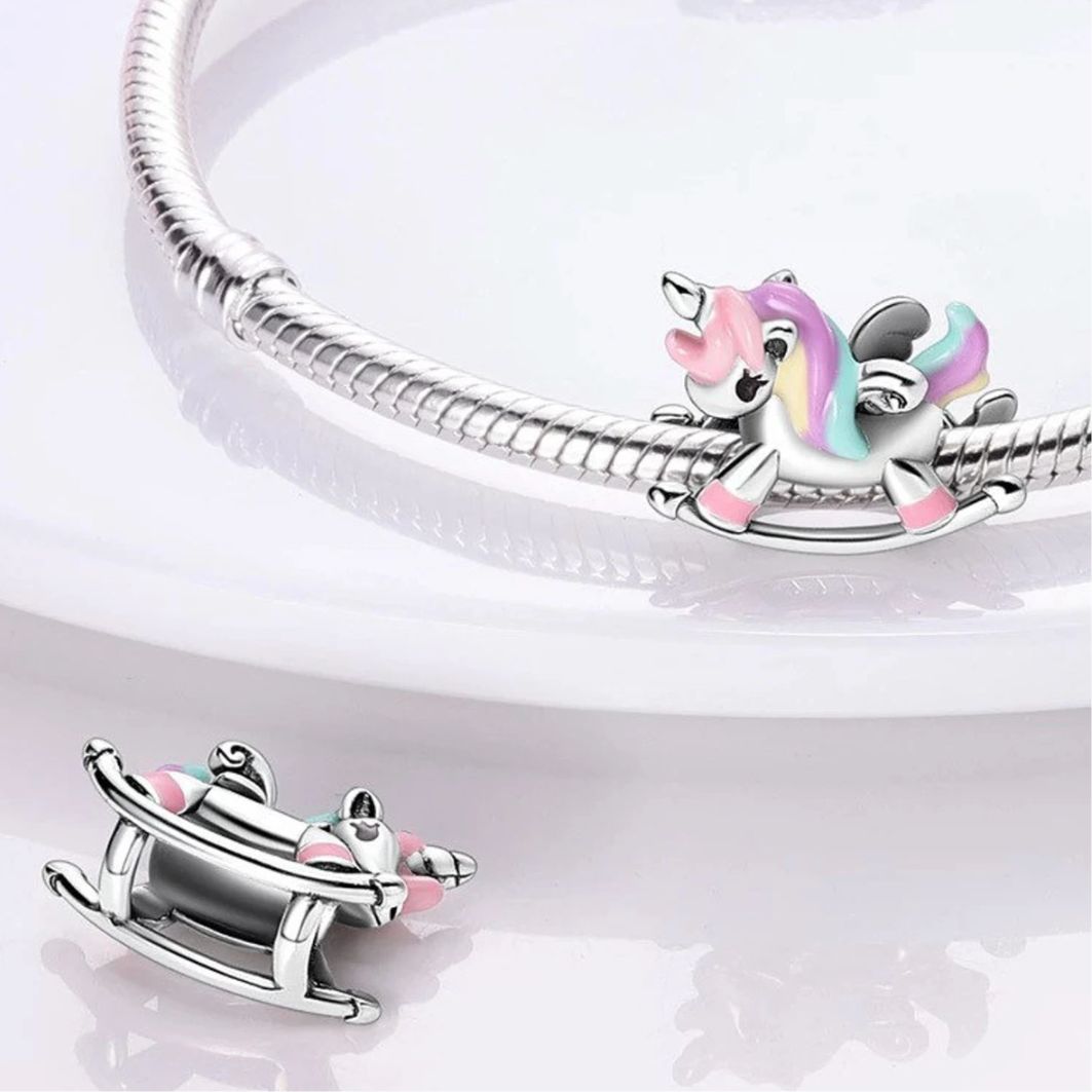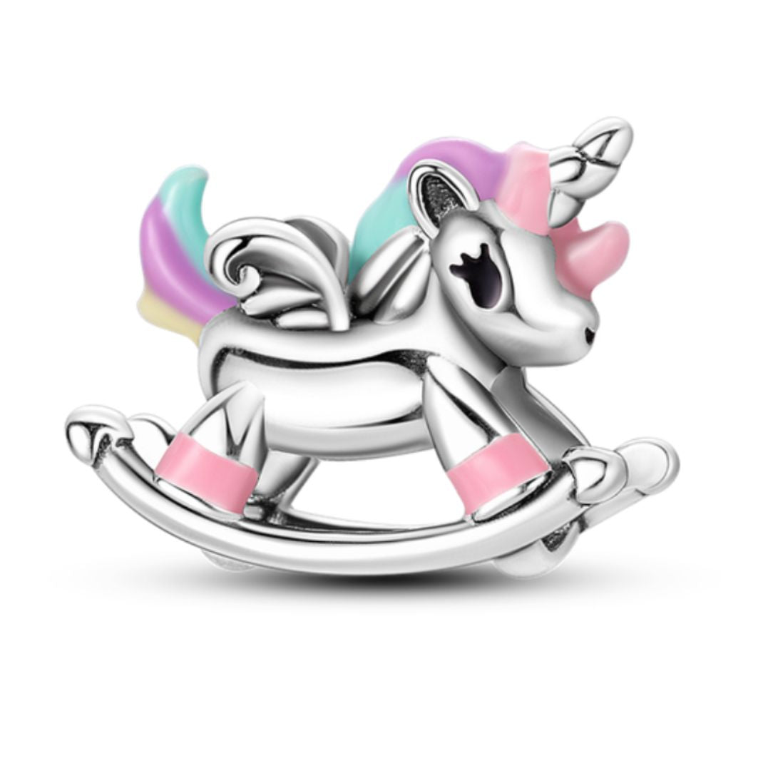 The Rocking Horse Unicorn Charm is a delightful and whimsical charm that evokes the joy of childhood, the magic of imagination, and the beauty of cherished memories. It's perfect for those who appreciate the nostalgia of simpler times, the allure of make-believe, and the charm of life's most enchanting moments. The design features an enchanting rocking horse unicorn with a gracefully curved horn, intricately detailed mane, and exquisitely carved rockers. Each element is adorned with vibrant enamel accents, capturing the essence of playful innocence, the spirit of imagination, and the magic of a world where anything is possible. This endearing accessory embodies the warmth of nostalgia, the joy of discovery, and the enchantment of life's most treasured memories.