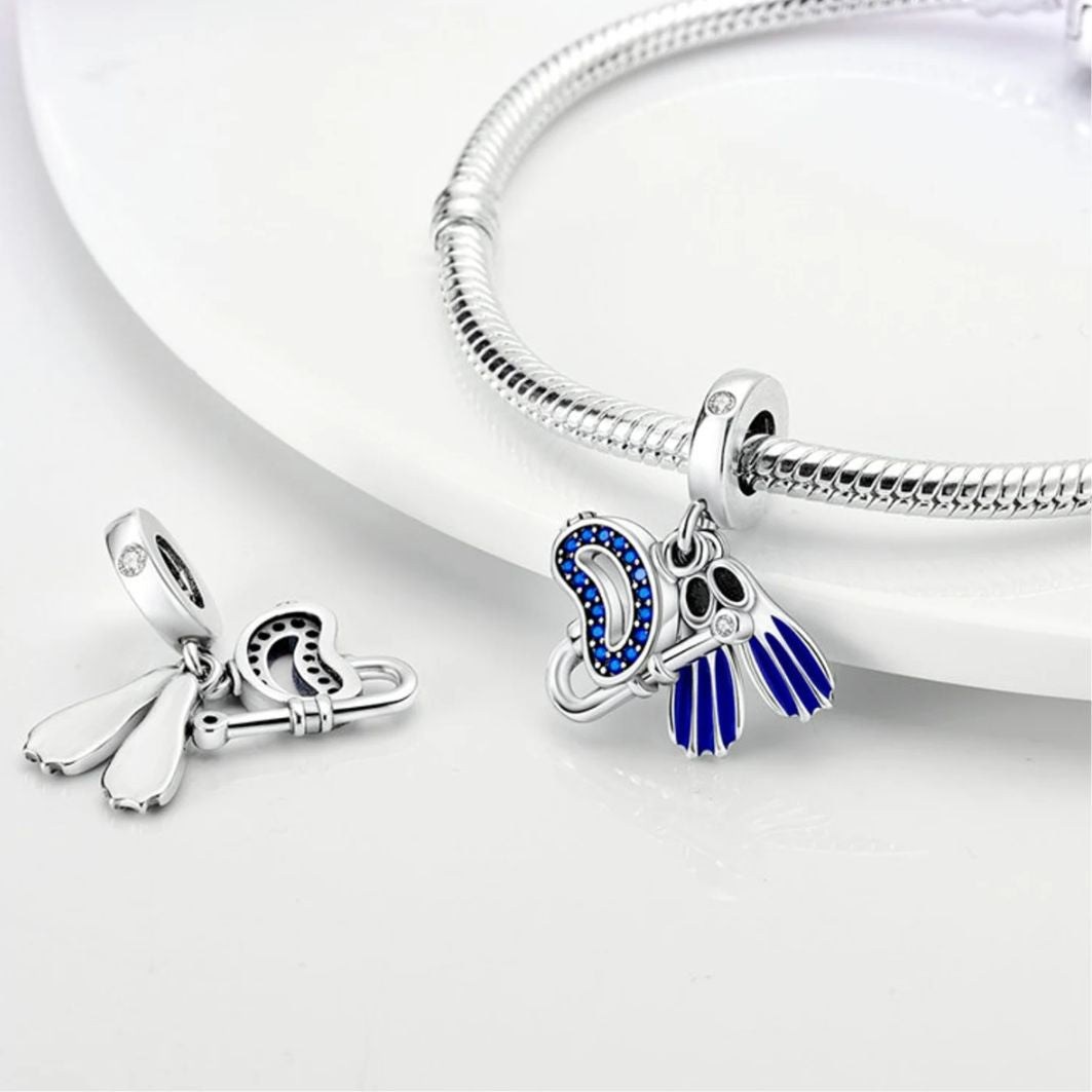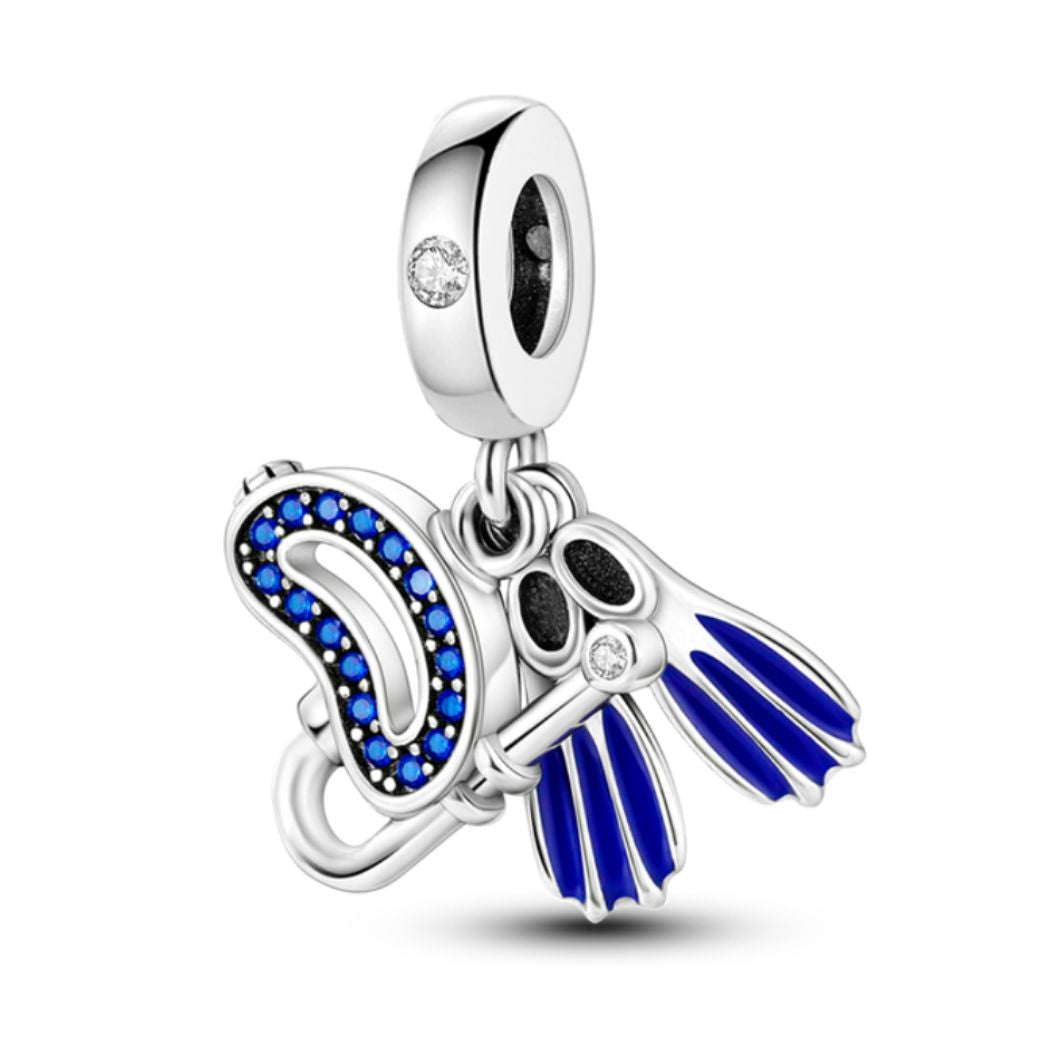 This Snorkeling Charm, in silver and blue, is the perfect way to show your love for underwater adventures. This exquisite charm is crafted with great attention to detail, making it a must-have for any water sports enthusiast. It features a sleek design of a snorkel, mask and flippers that perfectly captures the essence of snorkeling, whilst also adding a touch of vibrancy to your charm collection. This versatile charm can be easily added to a bracelet, necklace, or anklet, making it the perfect keepsake for any snorkeling or diving enthusiast. Whether you're an experienced scuba diver or simply enjoy swimming in the ocean, the Snorkeling Charm is the perfect way to express your love for underwater adventures.