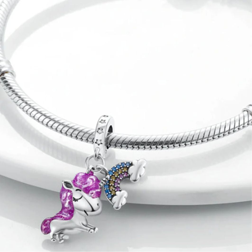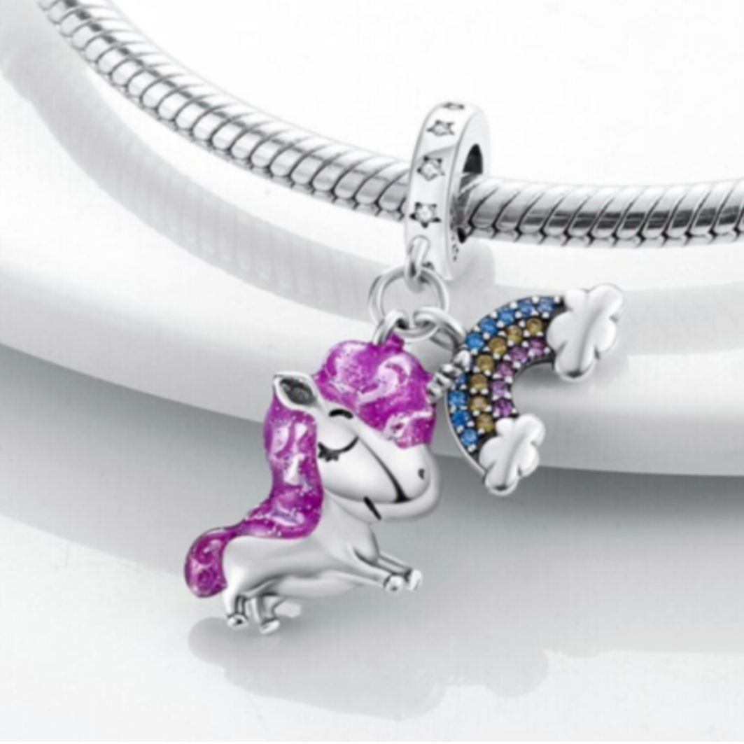 This enchanting and magical charm captures the wonder and whimsy of unicorns and rainbows. The charm features a detailed design of a cute unicorn with a purple mane and tail, standing next to a colourful rainbow. The Unicorn and Rainbow Charm is for those who love fantasy, magic and appreciate the beauty and wonder of unicorns and rainbows. It is perfect for adding a touch of fantasy and charm to your charm bracelet so get yours now!