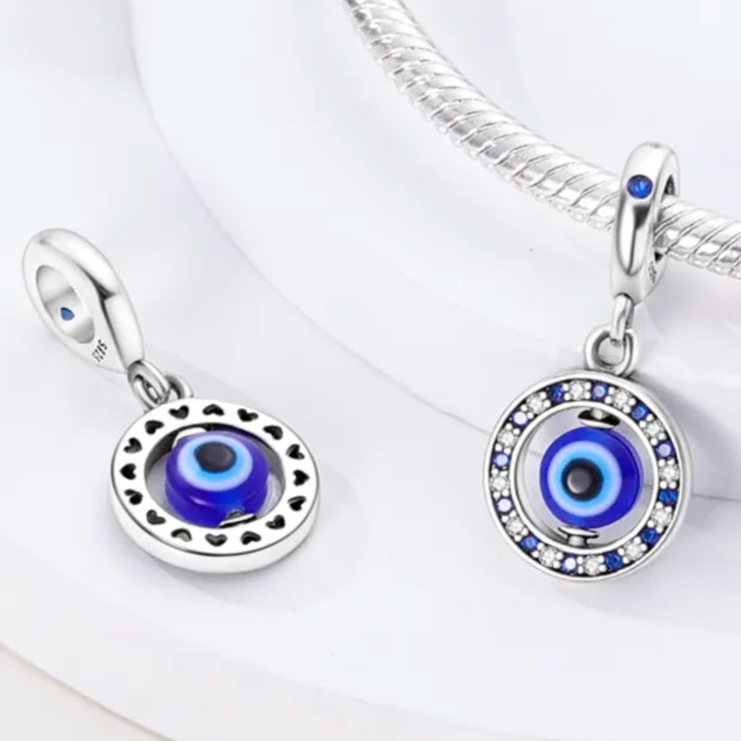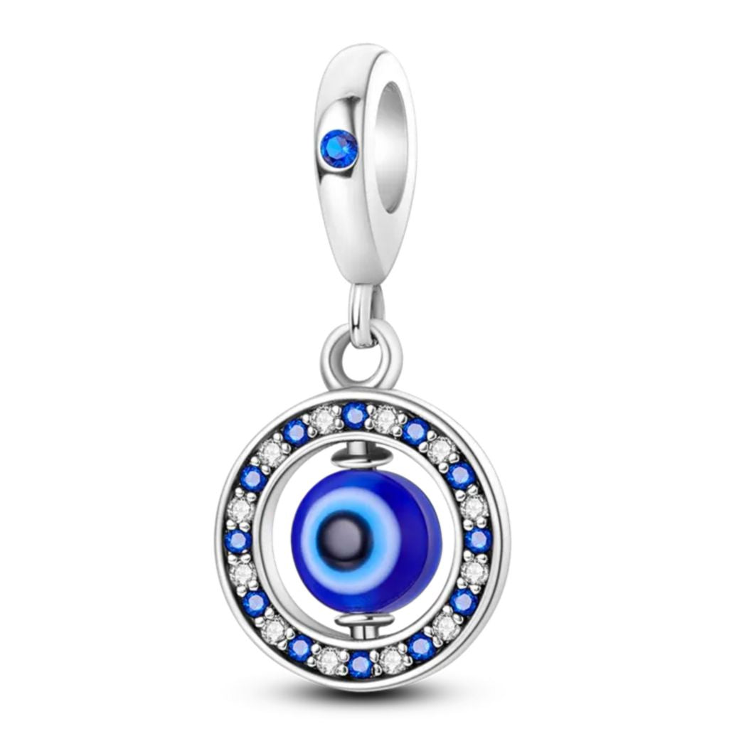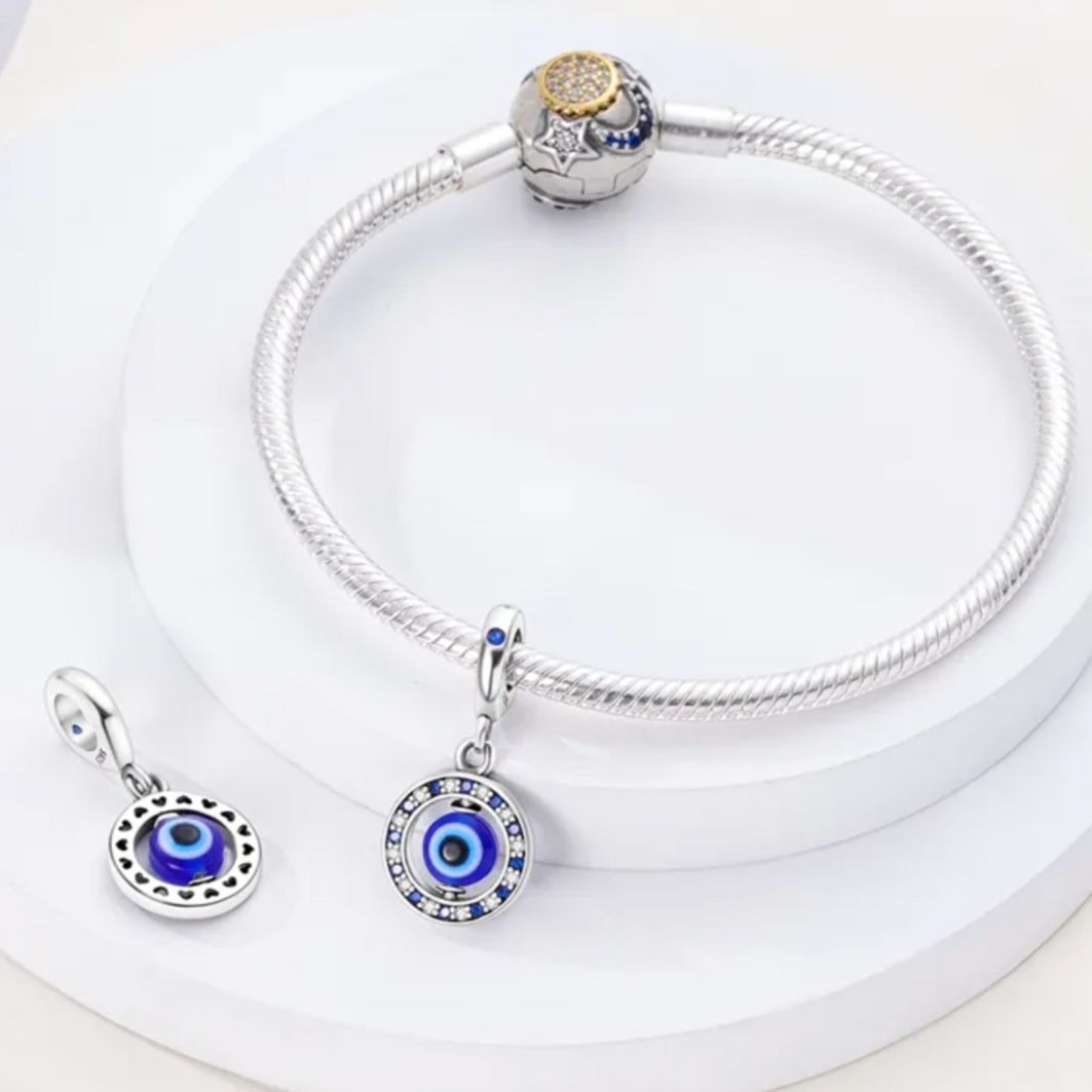 The Evil Eye charm is meticulously crafted, featuring a captivating blue eye, often associated with protective qualities, warding off negative energies and malevolent glares. The lush blue color of the eye is encompassed by a delicately crafted silver setting, providing a striking contrast and ensuring that the eye is the focal point, catching the gaze of onlookers.