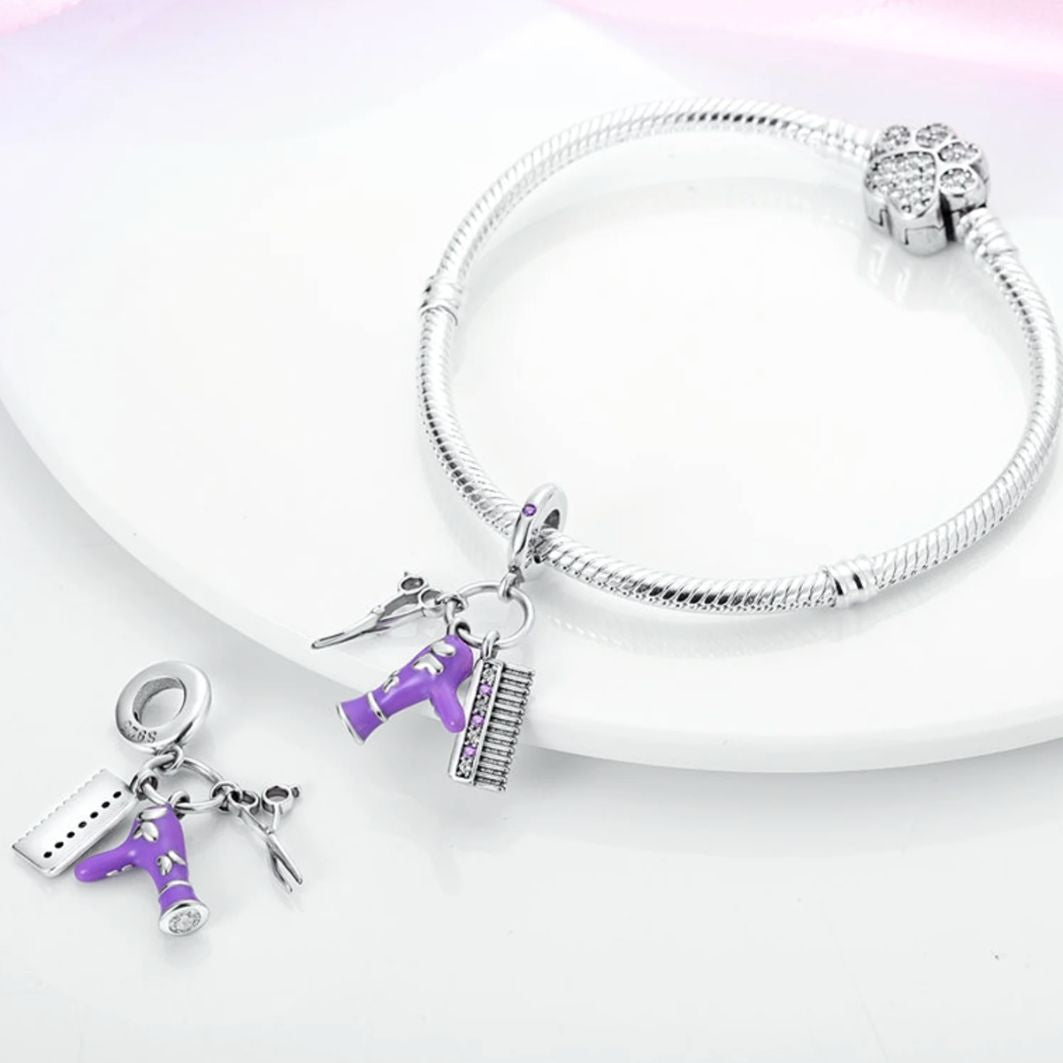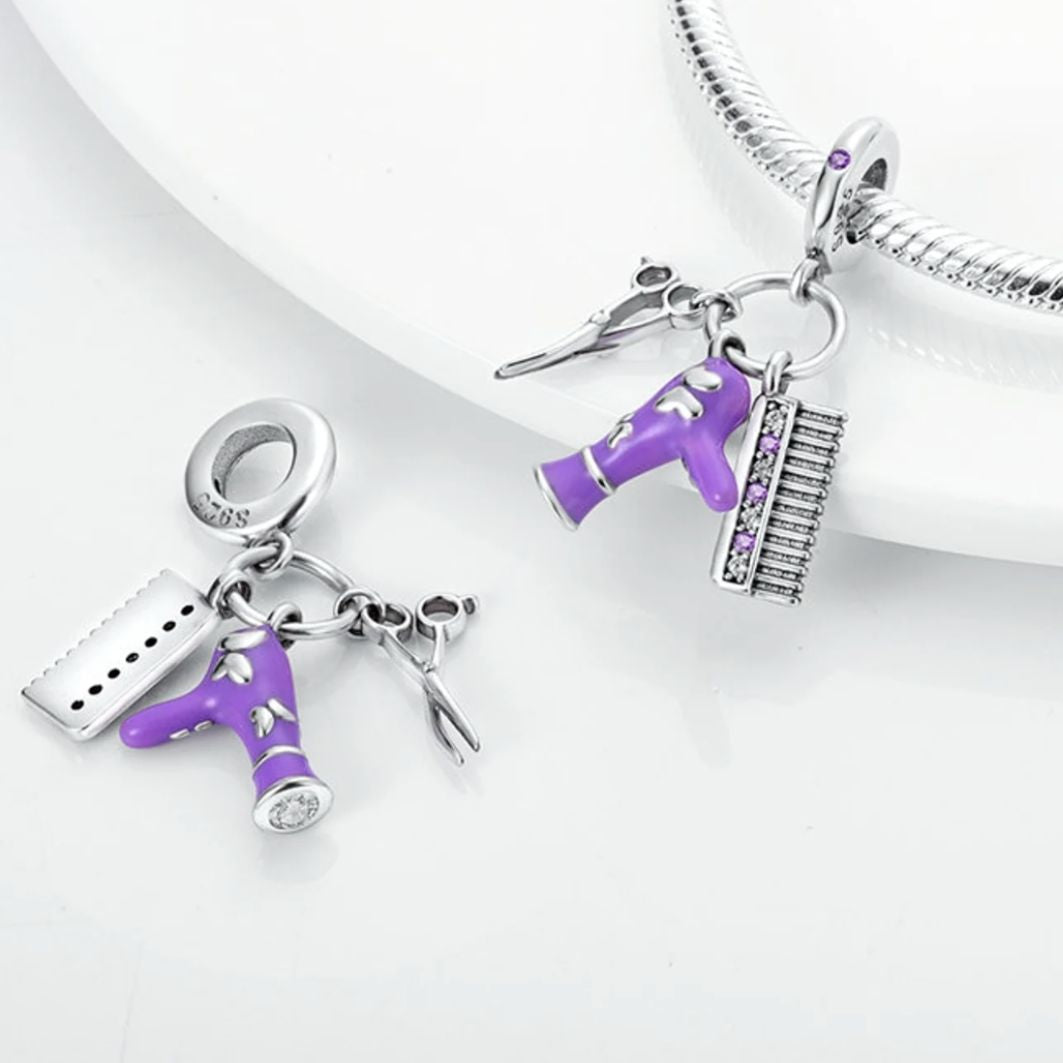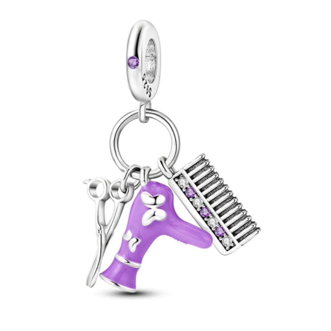 Unveil your passion for the world of hairstyling with the Hairdressing Trio Charm. A perfect ode to the art of hair transformation, this charm intricately showcases three iconic tools of the trade: a sleek hair dryer, sharp scissors, and a classic comb. Every detail of this charm serves as a testament to the skill and finesse of hairstylists everywhere.