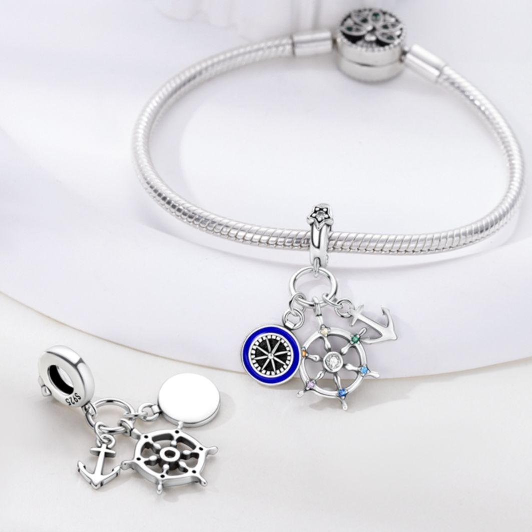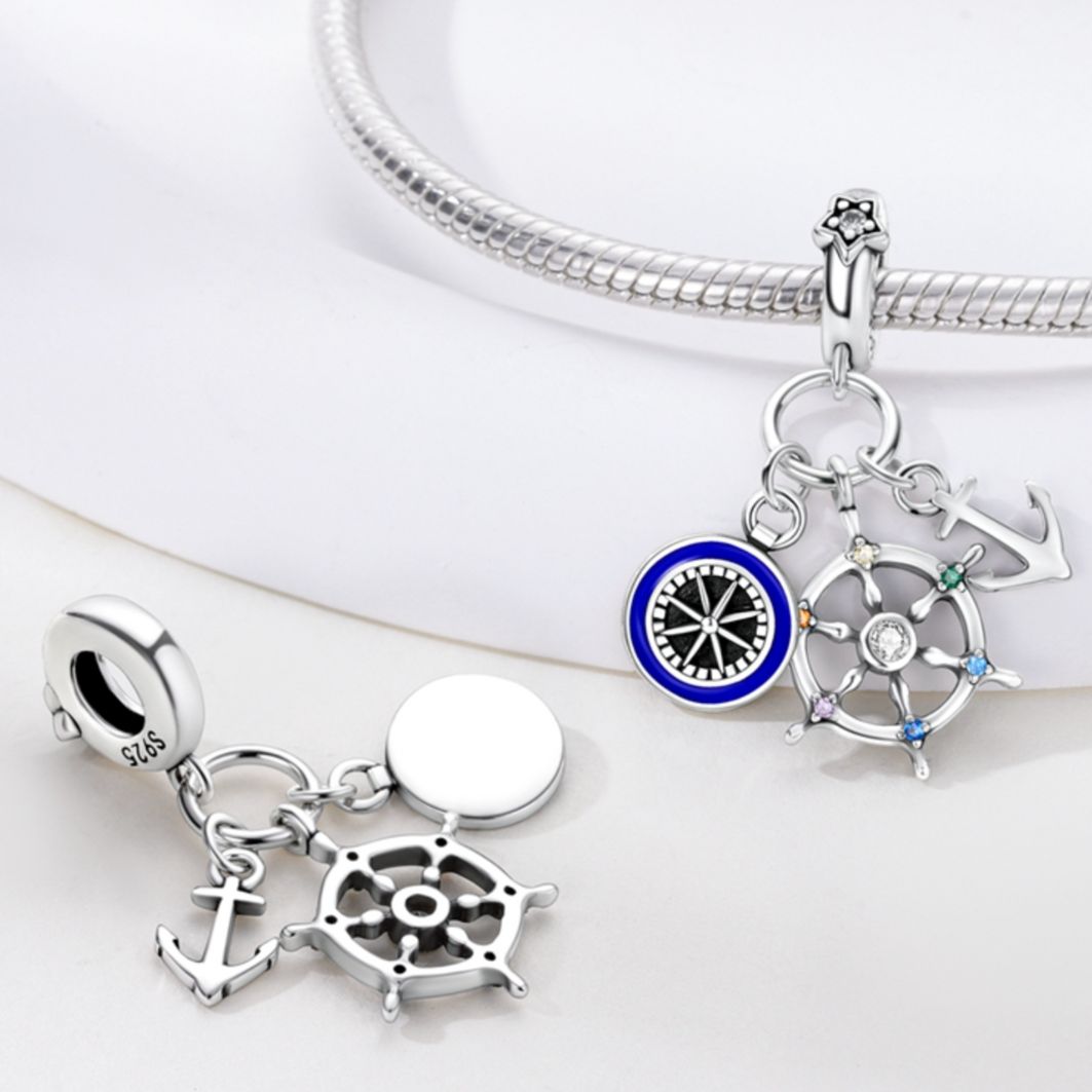 Dive deep into the nautical realm with this charm's three iconic symbols - a compass, ship's steering wheel and anchor. A beautifully detailed compass sits at the heart of this piece. Not just an instrument for physical navigation, it signifies life's direction, reminding wearers to stay true to their course and follow their heart's true north. A symbol of stability, security, and hope, the anchor represents our grounding forces, the people and values that keep us steady amidst life's ebbs and flows. The ship's steering wheel; an emblem of guidance and control stands for one's ability to steer through life's tumultuous waves and unpredictable storms. Its intricate design evokes a sense of wanderlust and the thrill of setting out on new voyages.