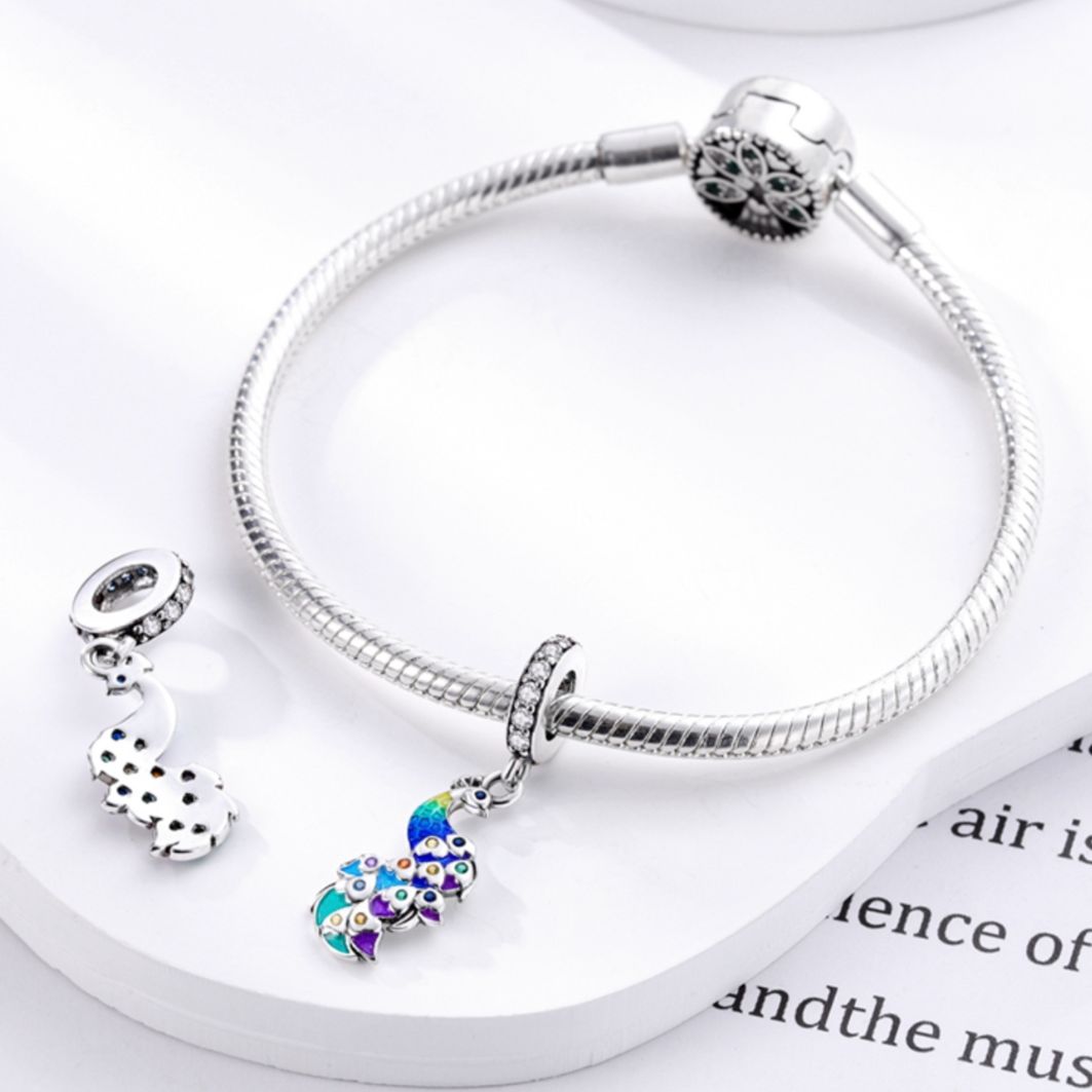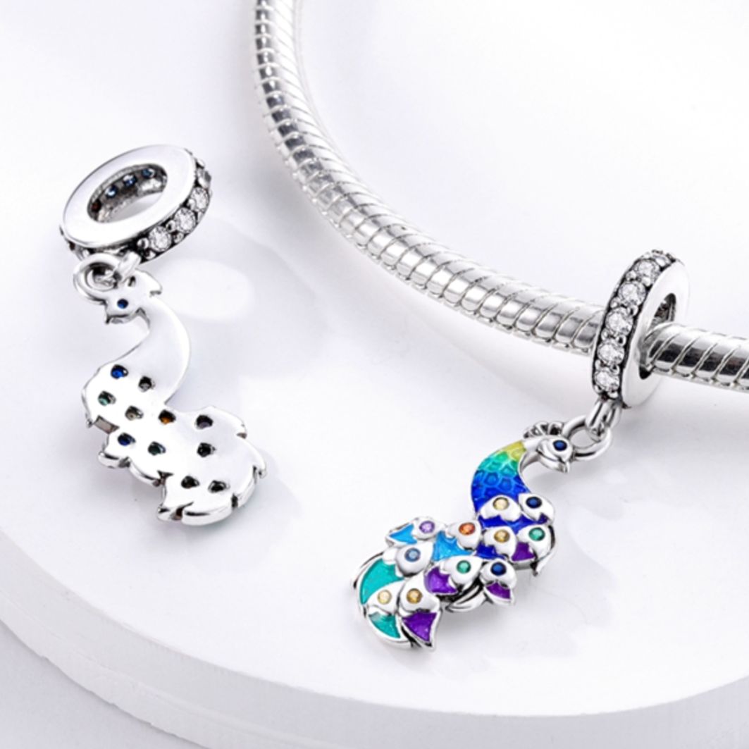 Made with utmost precision and dedication, our Peacock Charm boasts a luminescent shimmer, mirroring the natural glow of a peacock's feathers under sunlight. The charm's intricate design, paired with its premium, hypoallergenic materials, ensures that it remains both a visual and tactile delight.