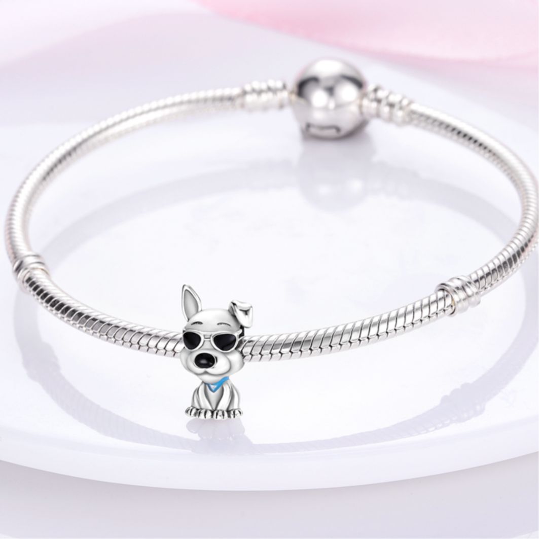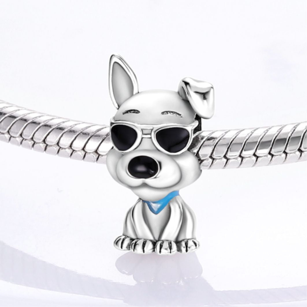 The Cool Dog Charm - a must-have addition to your charm collection for all dog lovers and pet parents. This endearing charm is designed to celebrate the unconditional love, loyalty, and joy that our furry companions bring into our lives. The design features an adorable dog wearing sunglasses and a bandana, showcasing its laid-back and cool personality. This playful charm perfectly captures the fun-loving spirit of our four-legged friends.